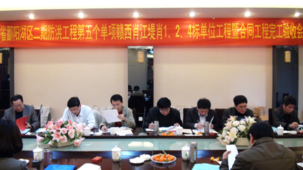 验收会由江西省鄱阳湖区二期防洪工程第五个单项工程建设项目部副主任陶理志主持,建设项目部总工程师邹军贤、宜春市水利局刘启明副局长、樟树市水利局吴学辉、公司副总经理胡鸿煌等出席了验收会。
