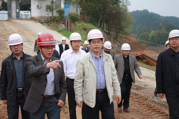 2012年4月6日,江西省水利厅副厅长廖瑞钊在宜春市副市长赖国根的陪同下,深入我公司承建的铜鼓县大塅水库除险加固工程项目视察指导事情。