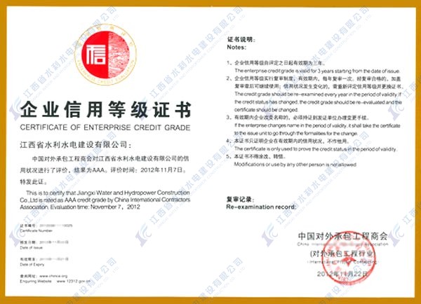 凭据商务部、国资委联合宣布的《商会协会行业信用建设事情指导意见》的要求,中国对外承包工程商会于2012年9月启动2012年度对外承包工程与劳务相助企业信用品级评价事情。经对外承包工程与劳务相助企业信用品级评审委员会第八次事情集会审议,江西省水利水电建设有限公司被评定为2012年度对外承包工程企业信用评价AAA级信用企业。