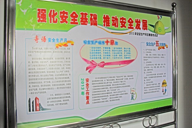 凭据2013年“宁静生产月”运动实施计划要求,公司所属各单位张贴、悬挂宁静生产警示语,突出宣传“强化宁静基础,推动宁静生长”的运动主题。