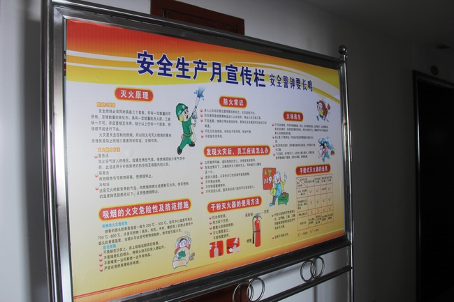 公司总部在办公楼悬挂“关注宁静,平安是福”、“强化宁静基础,推动宁静生长”横幅,并在办公楼内每层摆放2个宁静宣传牌。