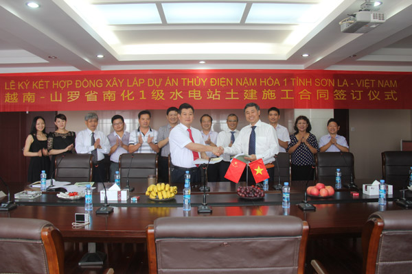 2013年7月22日,越南山罗省南化一级水电枢纽项目建设条约签字仪式在我公司南昌市总部顺利举行,越南ANPHA水电投资股份公司董事长阮平阳和我公司董事长王元旦划分代表双方签署条约。出席签约仪式的另有越南建设与机电股份公司(MECO)董事长阮玉平、ANPHA水电投资股份公司总经理陈重朵,我公司副总经理张周平、副总工程师邹春明、项目经理夏爱民等。