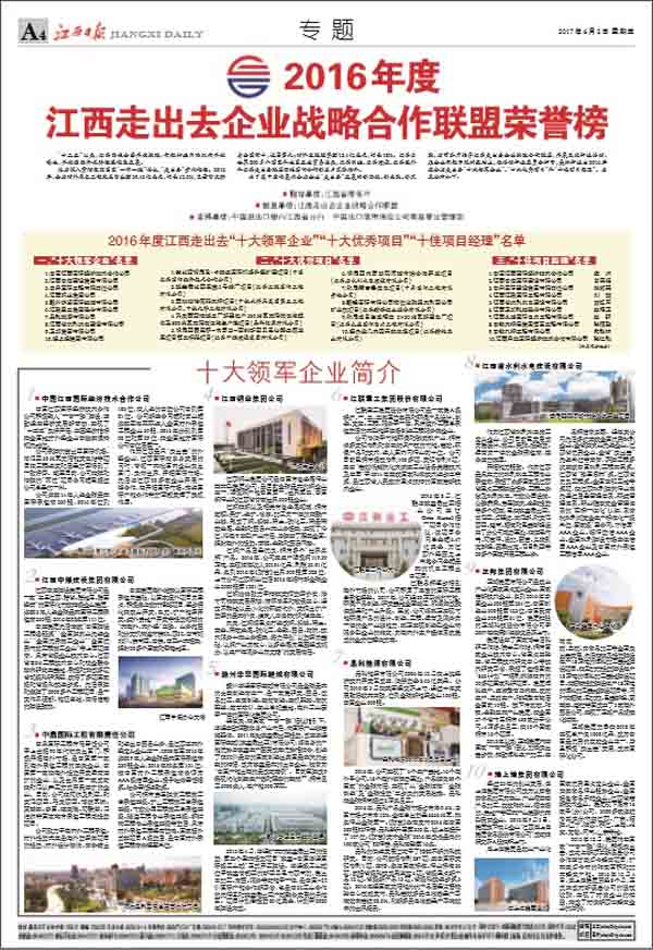 6月3日,江西走出去企颐魅战略相助联盟2017年大会在南昌召开。省委常委、常务副省长毛伟明出席大会并作重要讲话,会上省委常委、常务副省长毛伟明、省政府秘书长王亚联和省商务厅厅长王水平划分为2016年度全省走出去“十大领军企业”、“十大优秀项目”和“十佳项目经理”授牌。江西走出去企颐魅战略相助联盟轮值主席、中国江西国际经济技术相助公司总经理徐国建报告了2016年事情,国家开发银行江西分行、中国进出口银行江西省分行和中国出口信用包管公司南昌营管部作为联盟副主席单位谈话。公司董事长王元旦作为十大优秀项目的企业代表谈话。《江西日报》、《江西卫视》相继对大会进行了大幅报道。